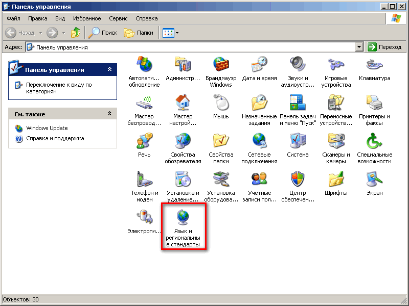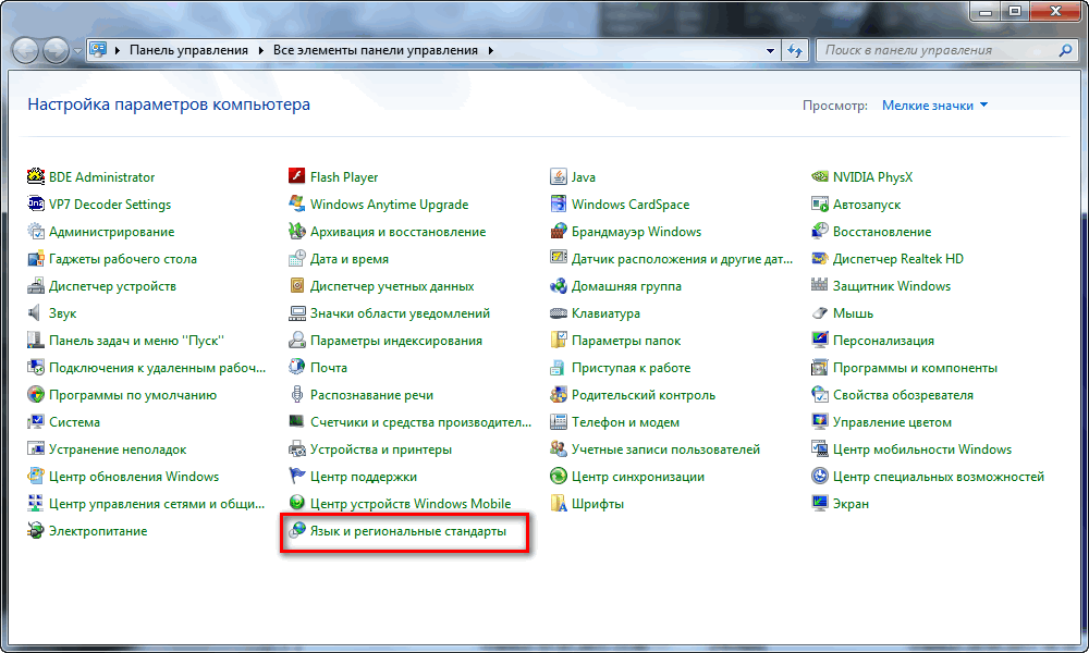 4) щелкните «Язык и региональные стандарты»: