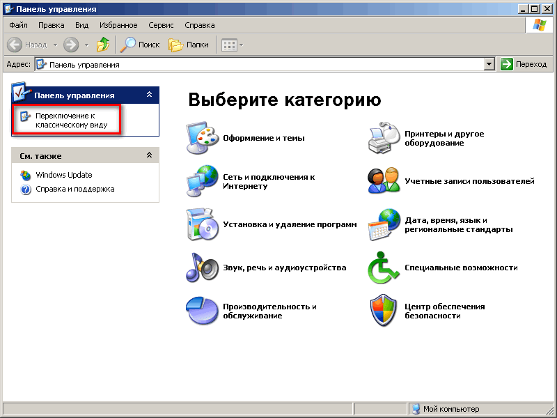 3) если у вас по умолчанию панель управления не в классическом виде показана, щелкните на «переключение к классическому виду»: